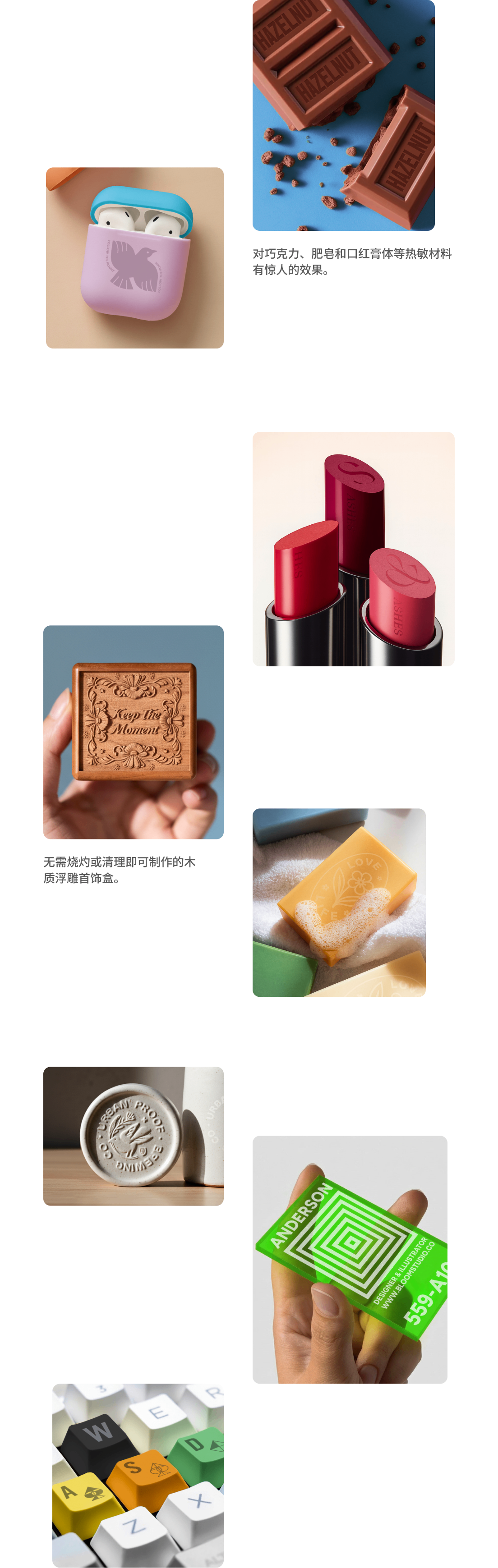 可激光雕刻材质:玻璃、水晶、亚克力、木材、金属、皮革、塑料、橡胶、硅胶、陶瓷等